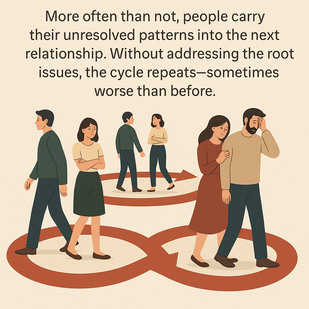 Reality: More often than not, people carry their unresolved patterns into the next relationship. Without addressing the root issues, the cycle repeats—sometimes worse than before. Many people end up regretting that they didn’t give their marriage more effort, patience, and guided support.